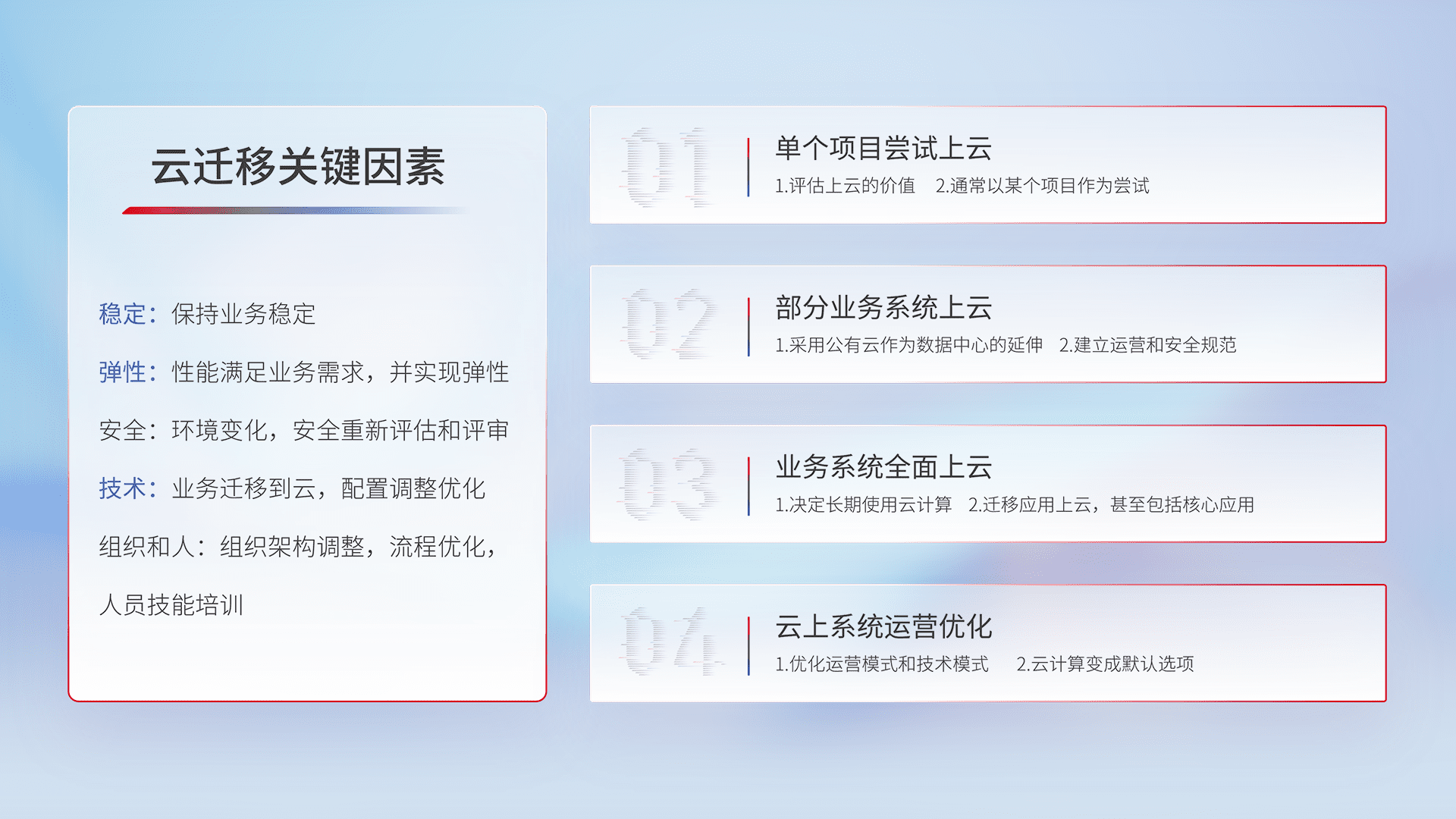 结合实际业务,,从规划设计、、云平台选型、、、云原生改造、、、、数据迁移、、、集成交付,,迁移全过程为客户识别最佳上云路径,,,,做好风险识别管理,,设计网络架构、、身份权限、、安全审计合规、、操作审计、、日志审计、、、、监控告警策略、、、多站点容灾设计等,,,对云上基础设施进行整体规划,,,,提升IT治理水平,,,,以满足弹性、、、、高可用、、、高性能的需求。。。
